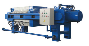 启动电机.通过减速机带动丝杠转动推动头板移动,压紧滤板,然后用锁紧螺母锁紧。用泵将带过虑的悬浮液输送至已压紧的各个滤室中,悬浮液中的液体透过滤布,通过各滤板上的滤液孔排至机外,悬浮液中的固体颗粒积聚于滤室中,逐渐形成滤饼,滤饼充满滤室,即完